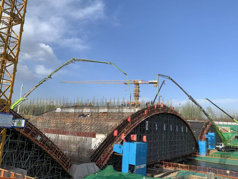 該橋采用單跨72米連續(xù)5跨設(shè)計,主腹拱作為橋梁的核心承重結(jié)構(gòu),是此次橋梁施工的核心節(jié)點,項目團隊順利克服弧形施工、模板一次成型、大體量澆筑、五跨精準落架等挑戰(zhàn),以“毫米級”精度貫穿施工全過程,為橋梁成型打造堅實“筋骨”。